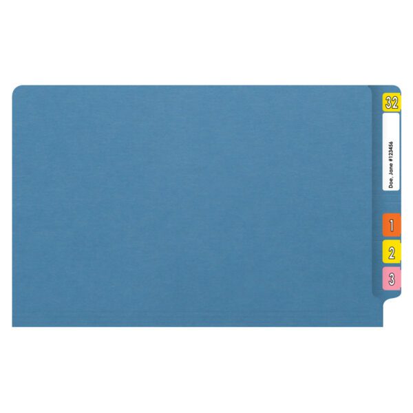 These blue legal size color folders can be used to categorize your documents and are easily found on your shelves. The 14 pt blue heavy duty color stock will last longer than standard 11 pt stock. This folder also includes a reinforced, or 2 ply end tab for even additional durability. This full cut end tab, with scored label placement marks, will provide a location to add end tab color filing labels that will be easily visible in shelf filing systems. THESE FOLDERS WILL NOT FIT IN FILE DRAWERS. The bottom of this folder is scored to be easily folded to provide up to 3/4″ expansion. This folder includes two heat bonded fasteners which keeps the front and back of the folder from catching in clothing, documents, or even fingernails and cuticles. These folders contain 10% recycled content with 10% post-consumer material.