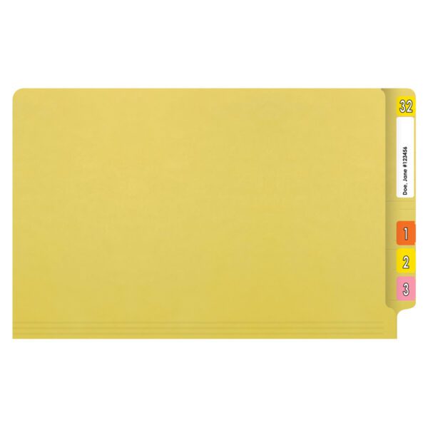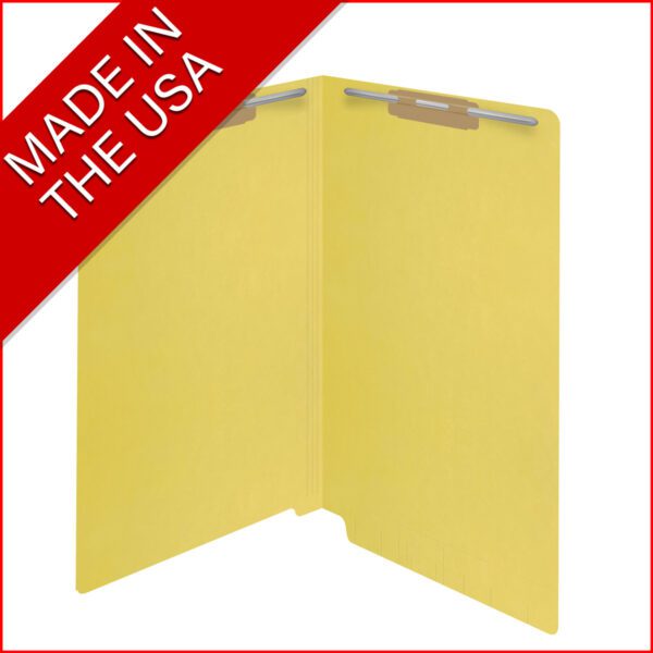 These yellow legal size color folders can be used to categorize your documents and are easily found on your shelves. The 14 pt yellow heavy duty color stock will last longer than standard 11 pt stock. This folder also includes a reinforced, or 2 ply end tab for even additional durability. This full cut end tab, with scored label placement marks, will provide a location to add end tab color filing labels that will be easily visible in shelf filing systems. THESE FOLDERS WILL NOT FIT IN FILE DRAWERS. The bottom of this folder is scored to be easily folded to provide up to 3/4″ expansion. This folder includes two heat bonded fasteners which keeps the front and back of the folder from catching in clothing, documents, or even fingernails and cuticles. These folders contain 10% recycled content with 10% post-consumer material.