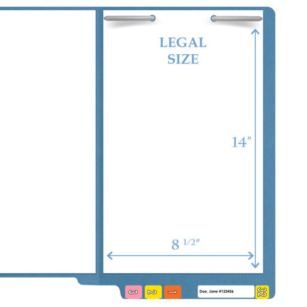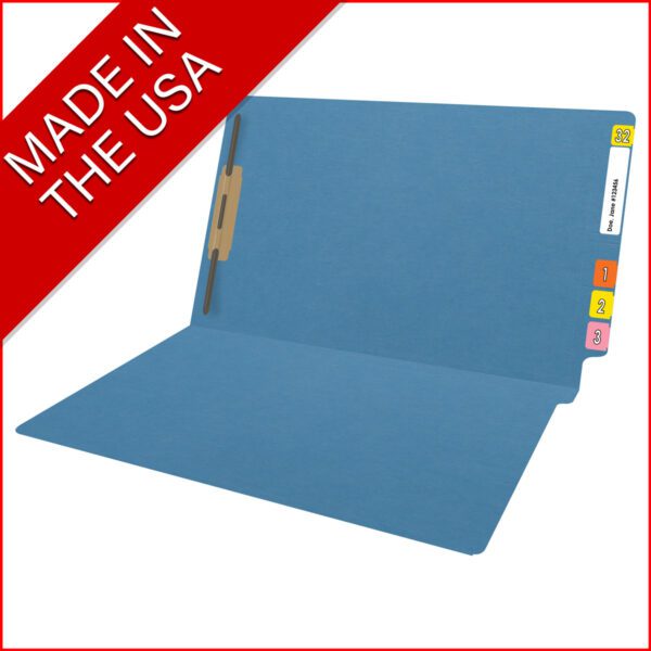 These blue legal size color folders can be used to categorize your documents and are easily found on your shelves. The 14 pt blue heavy duty color stock will last longer than standard 11 pt stock. This folder also includes a reinforced, or 2 ply end tab for even additional durability. This full cut end tab, with scored label placement marks, will provide a location to add end tab color filing labels that will be easily visible in shelf filing systems. THESE FOLDERS WILL NOT FIT IN FILE DRAWERS. The bottom of this folder is scored to be easily folded to provide up to 3/4″ expansion. This folder includes a heat bonded fasteners which keeps the front and back of the folder from catching in clothing, documents, or even fingernails and cuticles. These folders contain 10% recycled content with 10% post-consumer material.
