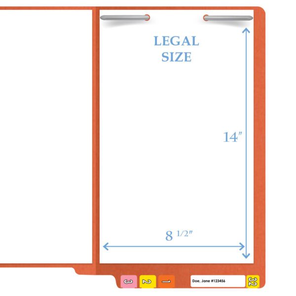 These orange legal size color folders can be used to categorize your documents and are easily found on your shelves. The 14 pt orange heavy duty color stock will last longer than standard 11 pt stock. This folder also includes a reinforced, or 2 ply end tab for even additional durability. This full cut end tab, with scored label placement marks, will provide a location to add end tab color filing labels that will be easily visible in shelf filing systems. THESE FOLDERS WILL NOT FIT IN FILE DRAWERS. The bottom of this folder is scored to be easily folded to provide up to 3/4″ expansion. This folder includes a heat bonded fasteners which keeps the front and back of the folder from catching in clothing, documents, or even fingernails and cuticles. These folders contain 10% recycled content with 10% post-consumer material.