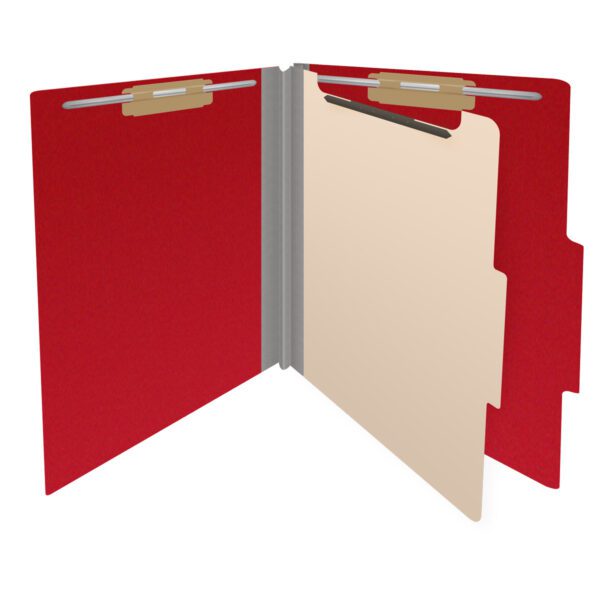 • This folder is made of 25 pt red pressboard stock and has one 18 pt manila dividers with duo fasteners.