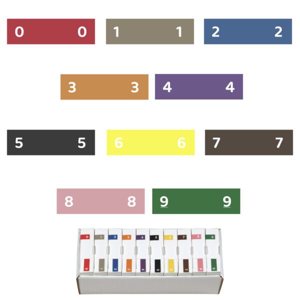 These are Ames compatible numeric labels. Each label wraps around the end of a file folder to label that folder for numerical filing. They feature a wrap-around solid color bar with a solid white number. The number will be visible on each side of the folder when applied. Each label is 1-3/4″ wide and 1/2″ high. Labels are laminated and sold in 10 roll of 1000.