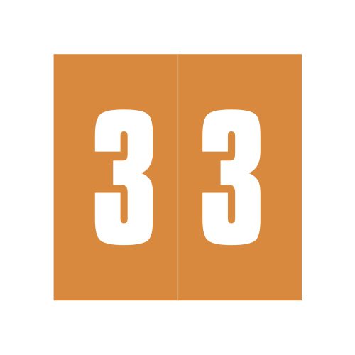 These are Ames compatible number “3” labels. Each label wraps around the end of a file folder to label that folder for numerical filing. They feature a wrap-around solid color bar with a solid white number “3”. The number “3” will be visible on each side of the folder when applied. Each label is 1-7/8″ wide and 1-7/8″ high. Labels are unlaminated and sold in roll of 1000.