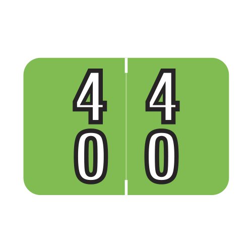 These are Barkley BXDM compatible “40” numeric labels. Each label wraps around the end of a file folder to label that folder for numerical filing. They feature a wrap-around solid green color bar with a solid white “40”. The “40” will be visible on each side of the folder when applied. Each label is 1-1/2″ wide and 1″ high. Labels are laminated and sold in rolls of 500.