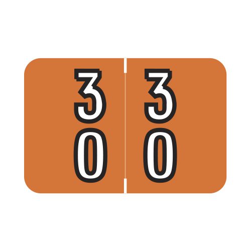 These are Barkley DBKM compatible “30” numeric labels. Each label wraps around the end of a file folder to label that folder for numerical filing. They feature a wrap-around solid solor bar with a solid white “30”. The “30” will be visible on each side of the folder when applied. Each label is 1-1/2″ wide and 1″ high. Labels are laminated and sold in rolls of 500.