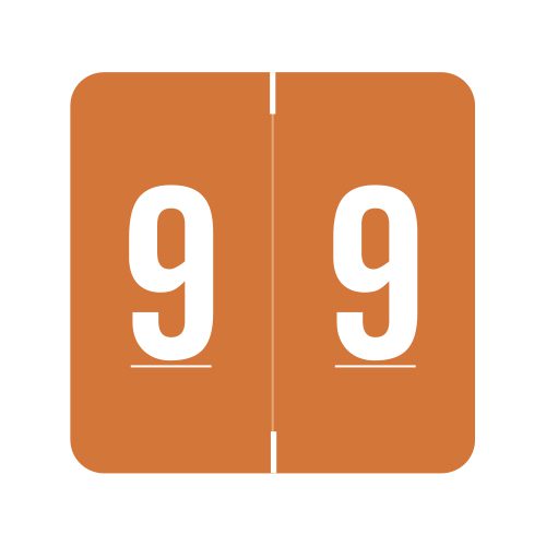 These are Barkley FNDBM-S compatible “9” numeric labels. Each label wraps around the end of a file folder to label that folder for numerical filing. They feature a wrap-around orange color bar with a solid white “9”. The “9” will be visible on each side of the folder when applied. Each label is 1-1/2″ wide and 1-1/2″ high. Labels are laminated and sold in rolls of 500.