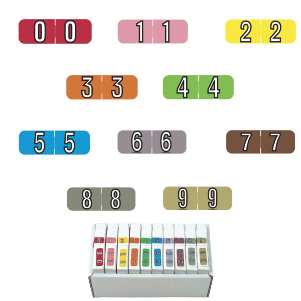 These are Barkley NBAM compatible mini numeric labels. Each label wraps around the end of a file folder to label that folder for numerical filing. They feature a wrap-around solid color bar with a solid white number. The number will be visible on each side of the folder when applied. Each label is 1-1/2″ wide and 1/2″ high. Labels are laminated and sold in rolls of 500.