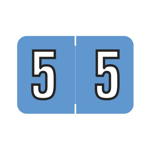 These are Barkley NBKM compatible number “5” labels. Each label wraps around the end of a file folder to label that folder for numerical filing. They feature a wrap-around solid solor bar with a solid white “5” outlined in black. The number “5” will be visible on each side of the folder when applied. Each label is 1-1/2″ wide and 1″ high. Labels are laminated and sold in rolls of 500.