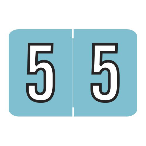 These are Barkley NCPM compatible number “5” labels. Each label wraps around the end of a file folder to label that folder for numerical filing. They feature a wrap-around solid light blue color bar with a solid white “5” outlined in black. The number “5” will be visible on each side of the folder when applied. Each label is 1-1/2″ wide and 1″ high. Labels are laminated and sold in rolls of 500.