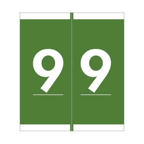 These are Barkley NSFM compatible number “9” labels. Each label wraps around the end of a file folder to label that folder for numerical filing. They feature a wrap-around solid green color bar with a solid white “9”. The number “9” will be visible on each side of the folder when applied. Each label is 1-1/2″ wide and 1″ high. Labels are laminated and sold in rolls of 500.