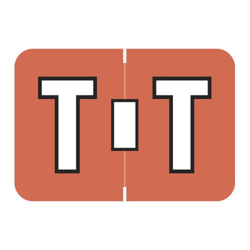These are Colwell Jewel Tone Letter “T” Alpha Labels. Each label wraps around the end of a file folder to label that folder for alphabetical filing. These labels are solid dark orange with a double white letter “T” character. The “T” will be visible on each side of the folder when applied. Each label is 1″ Wide x 1-1/2″ high. Labels are laminated and sold in roll of 500.