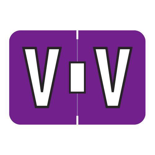 These are Colwell Jewel Tone Letter “V” Alpha Labels. Each label wraps around the end of a file folder to label that folder for alphabetical filing. These labels are solid purple with a double white letter “V” character. The “V” will be visible on each side of the folder when applied. Each label is 1″ Wide x 1-1/2″ high. Labels are laminated and sold in roll of 500.