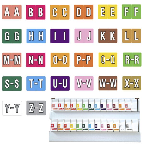 Datafile Compatible Alpha Labels, Letter “A-Z” set tray, Multiple Color, Laminated Stock, 15/16″ X 1-1/4″ Individual Letters – 26 Rolls of 500