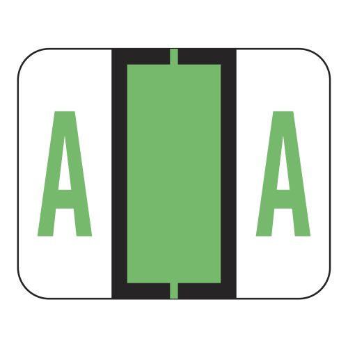 These are File Doctor compatible letter “A” alpha labels. Each label wraps around the end of a file folder to label that folder for alphabetical filing. These alphabetic labels feature a wrap-around solid bar and a fluroscent green colored “A” printed on a white background. The “A” will be visible on each side of the folder when applied. Each label is 1-1/4″ wide and 1″ high. Labels are laminated and sold in rolls of 500.