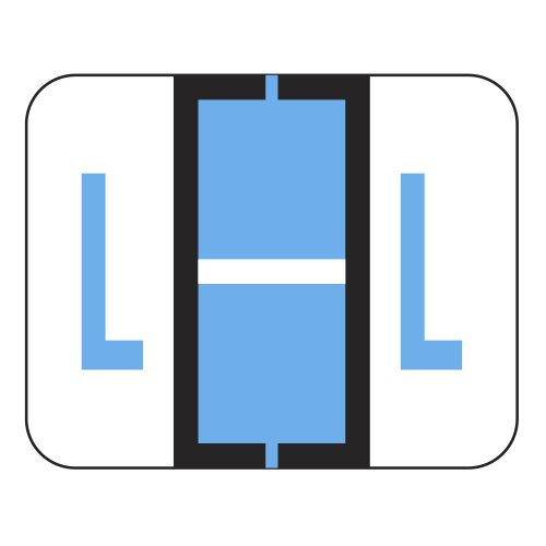 These are File Doctor compatible letter “L” alpha labels. Each label wraps around the end of a file folder to label that folder for alphabetical filing. These alphabetic labels feature a wrap-around solid bar and a blue colored “L” printed on a white background. The “L” will be visible on each side of the folder when applied. Each label is 1-1/4″ wide and 1″ high. Labels are laminated and sold in rolls of 500.