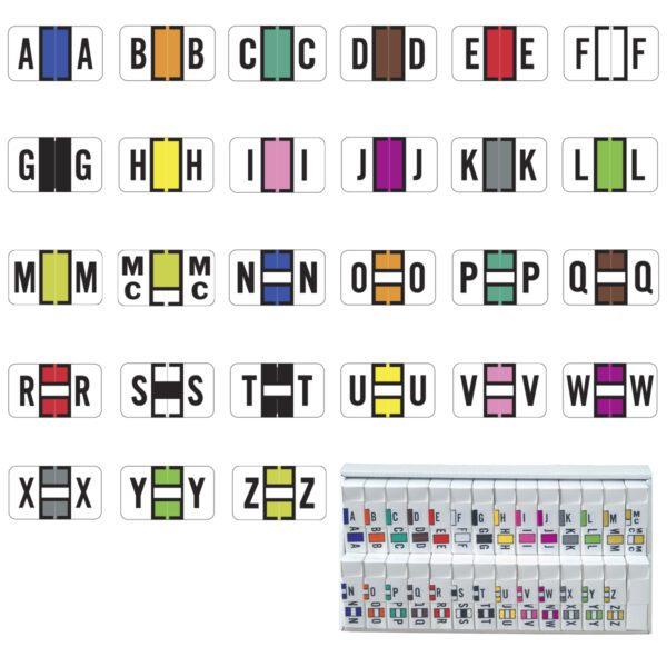 These are Jeter 0200 compatible letter “A-Z” plus Mc labels. Each label wraps around the end of a file folder to label that folder for alphabetical filing. These labels feature a wrap-around solid color bar and a colored letter printed on a white background. The letter will be visible on each side of the folder when applied. Each labels is 1-5/8″ wide and 15/16″ high. Labels are laminated and sold in 27 rolls of 500.