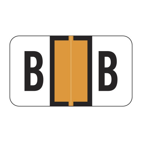 These are Jeter 0200 compatible letter “B” labels. Each label wraps around the end of a file folder to label that folder for alphabetical filing. These labels feature a wrap-around solid orange color bar and a black colored “B” printed on a white background. The “B” will be visible on each side of the folder when applied. Each label is 1-5/8″ wide and 15/16″ high. Labels are laminated and sold in rolls of 500.