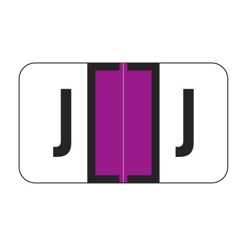 These are Jeter 0200 compatible letter “J” labels. Each label wraps around the end of a file folder to label that folder for alphabetical filing. These labels feature a wrap-around solid purple color bar and a black colored “J” printed on a white background. The “J” will be visible on each side of the folder when applied. Each label is 1-5/8″ wide and 15/16″ high. Labels are laminated and sold in rolls of 500.