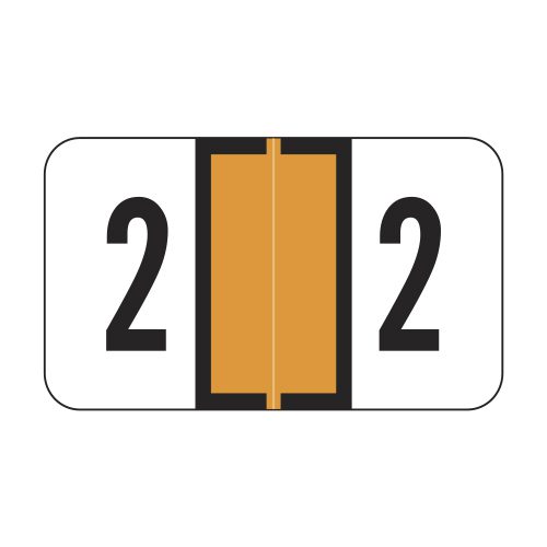 These are Jeter 2600 compatible number “2” labels. Each label wraps around the end of a file folder to label that folder for numerical filing. They feature a wrap-around solid orange color bar and a black color number “2” printed on a white background. The number “2” will be visible on each side of the folder when applied. Each label is 1-5/8″ wide and 15/16″ high. Labels are laminated and sold per roll of 500.