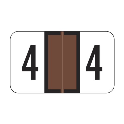 These are Jeter 2600 compatible number “4” labels. Each label wraps around the end of a file folder to label that folder for numerical filing. They feature a wrap-around solid brown color bar and a black color number “4” printed on a white background. The number “4” will be visible on each side of the folder when applied. Each label is 1-5/8″ wide and 15/16″ high. Labels are laminated and sold per roll of 500.