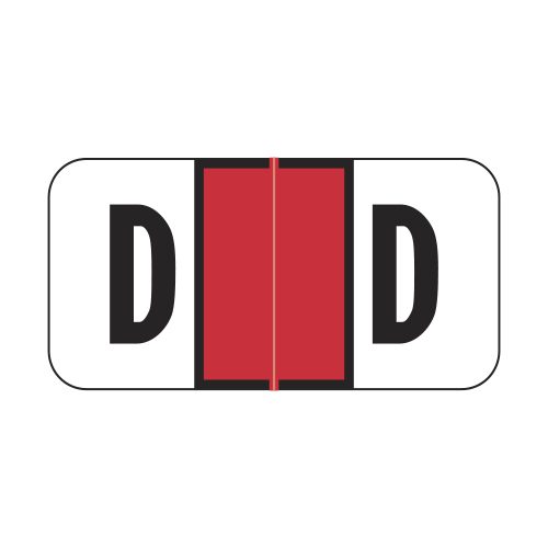 These are Jeter 2900 compatible letter “D” labels. Each label wraps around the end of a file folder to label that folder for alphabetical filing. These labels feature a wrap-around solid red color bar and a colored “D” printed on a white background. The “D” will be visible on each side of the folder when applied. Each labels is 1-1/2″ wide and 3/4″ high. Labels are laminated and sold in rolls of 500.