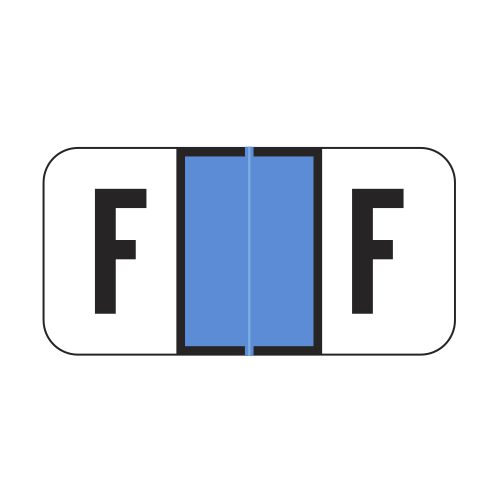 These are Jeter 2900 compatible letter “F” labels. Each label wraps around the end of a file folder to label that folder for alphabetical filing. These labels feature a wrap-around solid blue color bar and a colored “F” printed on a white background. The “F” will be visible on each side of the folder when applied. Each labels is 1-1/2″ wide and 3/4″ high. Labels are laminated and sold in rolls of 500.