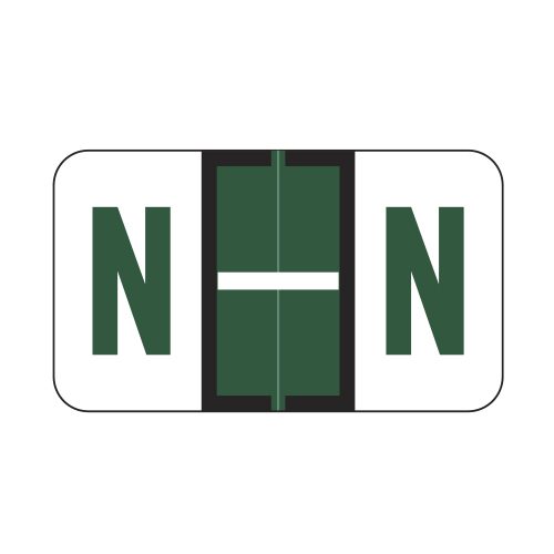 These are Jeter 5100 compatible letter “N” alpha labels. Each label wraps around the end of a file folder to label that folder for alphabetical filing. These labels feature a wrap-around solid dark green bar and a colored letter “N” printed on a white background. The letter “N” will be visible on each side of the folder when applied. Each label is 1-5/8″ wide and 15/16″ high. Labels are laminated and sold in rolls of 500.