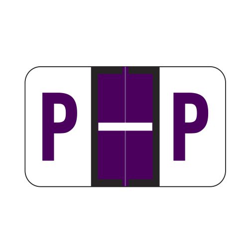 These are Jeter 5100 compatible letter “P” alpha labels. Each label wraps around the end of a file folder to label that folder for alphabetical filing. These labels feature a wrap-around solid purple color bar and a colored letter “P” printed on a white background. The letter “P” will be visible on each side of the folder when applied. Each label is 1-5/8″ wide and 15/16″ high. Labels are laminated and sold in roll of 500.