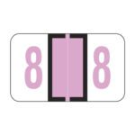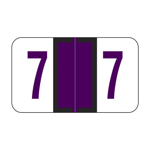 These are Jeter 6100 compatible number “7” labels. Each label wraps around the end of a file folder to label that folder for numerical filing. They feature a wrap-around solid purple color bar and a matching color number “7” printed on a white background. The number “7” will be visible on each side of the folder when applied. Each label is 1-5/8″ wide and 15/16″ high. Labels are laminated and sold per roll of 500.