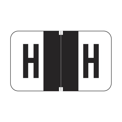 These are Jeter 7200 compatible letter “H” labels. Each label wraps around the end of a file folder to label that folder for alphabetical filing. These labels feature a wrap-around solid black color bar and a colored “H” printed on a white background. The “H” will be visible on each side of the folder when applied. Each labels is 1-5/8″ wide and 15/16″ high. Labels are laminated and sold in rolls of 500.