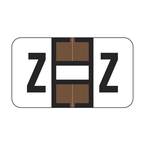 These are Jeter 7200 compatible letter “Z” labels. Each label wraps around the end of a file folder to label that folder for alphabetical filing. These labels feature a wrap-around solid brown color bar and a colored “Z” printed on a white background. The “Z” will be visible on each side of the folder when applied. Each labels is 1-5/8″ wide and 15/16″ high. Labels are laminated and sold in rolls of 500.