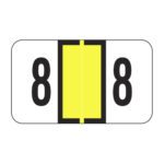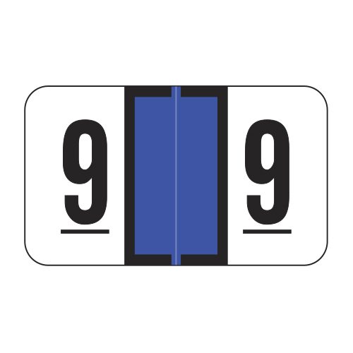 These are Jeter 7300 compatible number “9” labels. Each label wraps around the end of a file folder to label that folder for numerical filing. They feature a wrap-around solid dark blue color bar and a black number “9” printed on a white background. The number “9” will be visible on each side of the folder when applied. Each label is 1-5/8″ wide and 15/16″ high. Labels are laminated and sold per roll of 500.