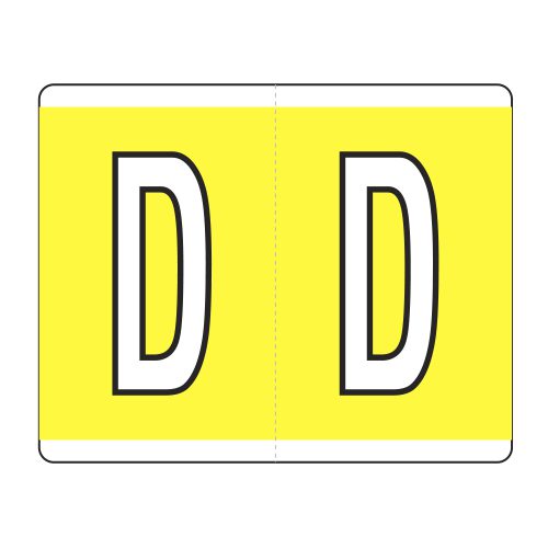 These are Kardex PSF-139 compatible letter alpha labels. Each label wraps around the end of a file folder to label that folder for alphabetical filing. These alphabetic labels feature a wrap-around solid bar and a colored letter “D” printed on a yellow background. The letter will be visible on each side of the folder when applied. Each label is 1-1/2″ wide and 1-1/4″ high. Labels are laminated and sold in rolls of 500.