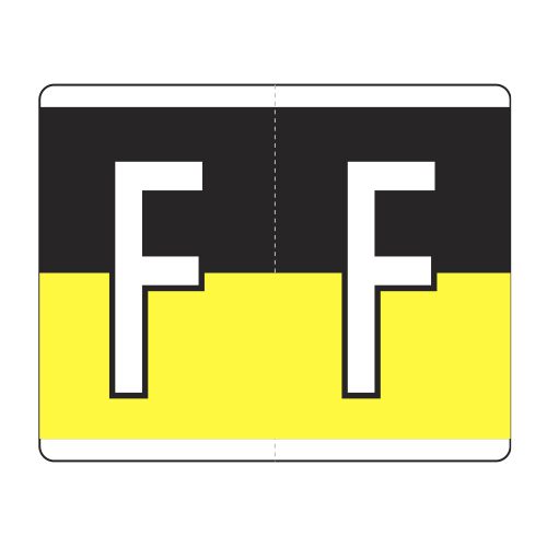 These are Kardex PSF-139 compatible letter alpha labels. Each label wraps around the end of a file folder to label that folder for alphabetical filing. These alphabetic labels feature a wrap-around solid bar and a colored letter “F” printed on a yellow/black background. The letter will be visible on each side of the folder when applied. Each label is 1-1/2″ wide and 1-1/4″ high. Labels are laminated and sold in rolls of 500.