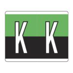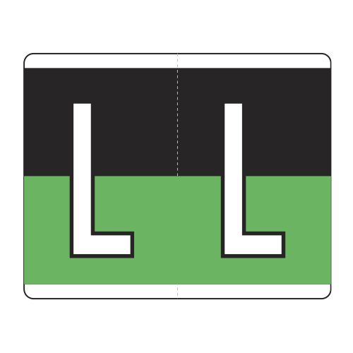 These are Kardex PSF-139 compatible letter alpha labels. Each label wraps around the end of a file folder to label that folder for alphabetical filing. These alphabetic labels feature a wrap-around solid bar and a colored letter “L” printed on a green/black background. The letter will be visible on each side of the folder when applied. Each label is 1-1/2″ wide and 1-1/4″ high. Labels are laminated and sold in rolls of 500.