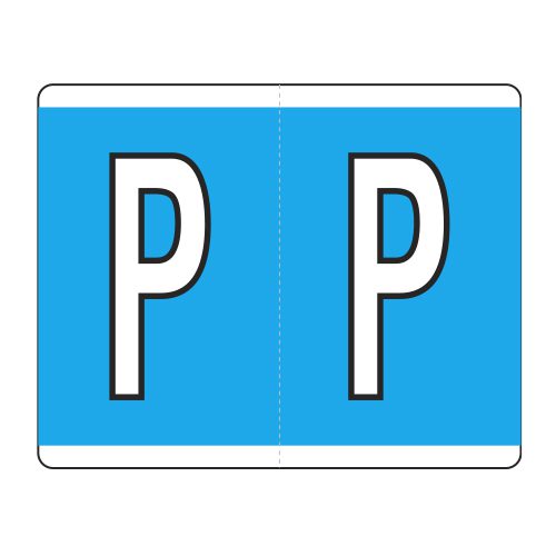 These are Kardex PSF-139 compatible letter alpha labels. Each label wraps around the end of a file folder to label that folder for alphabetical filing. These alphabetic labels feature a wrap-around solid bar and a colored letter “P” printed on a blue background. The letter will be visible on each side of the folder when applied. Each label is 1-1/2″ wide and 1-1/4″ high. Labels are laminated and sold in rolls of 500.