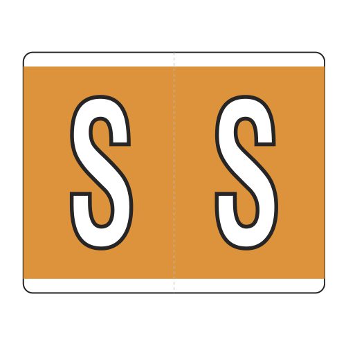 These are Kardex PSF-139 compatible letter alpha labels. Each label wraps around the end of a file folder to label that folder for alphabetical filing. These alphabetic labels feature a wrap-around solid bar and a colored letter “S” printed on a orange background. The letter will be visible on each side of the folder when applied. Each label is 1-1/2″ wide and 1-1/4″ high. Labels are laminated and sold in rolls of 500.