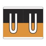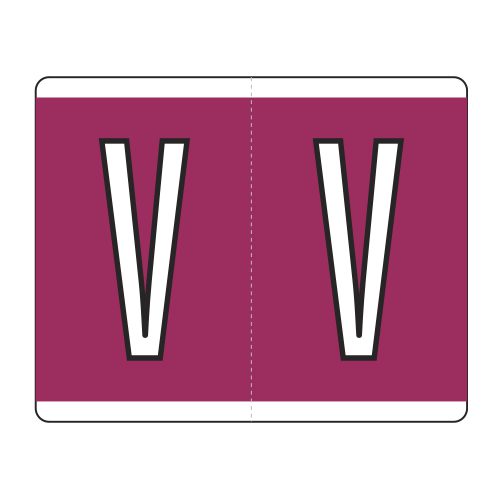 These are Kardex PSF-139 compatible letter alpha labels. Each label wraps around the end of a file folder to label that folder for alphabetical filing. These alphabetic labels feature a wrap-around solid bar and a colored letter “V” printed on a dark pink background. The letter will be visible on each side of the folder when applied. Each label is 1-1/2″ wide and 1-1/4″ high. Labels are laminated and sold in rolls of 500.