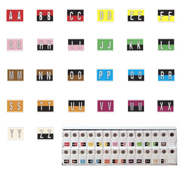 These are Kardex PSF-139 compatible letter alpha labels. Each label wraps around the end of a file folder to label that folder for alphabetical filing. These alphabetic labels feature a wrap-around solid bar and a colored letter printed on a white background. The letter will be visible on each side of the folder when applied. Each label is 1-1/2″ wide and 1-1/4″ high. Labels are laminated and sold in 26 rolls of 500.