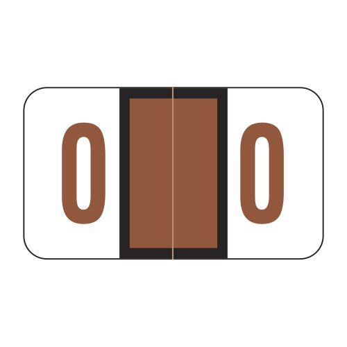 These are POS 3500 compatible number “0” labels. Each label wraps around the end of a file folder to label that folder for numerical filing. They feature a wrap-around solid brown color bar and a matching color number “0” printed on a white background. The number “0” will be visible on each side of the folder when applied. Each label is 1-5/8″ wide and 15/16″ high. Labels are laminated and sold per roll of 500.