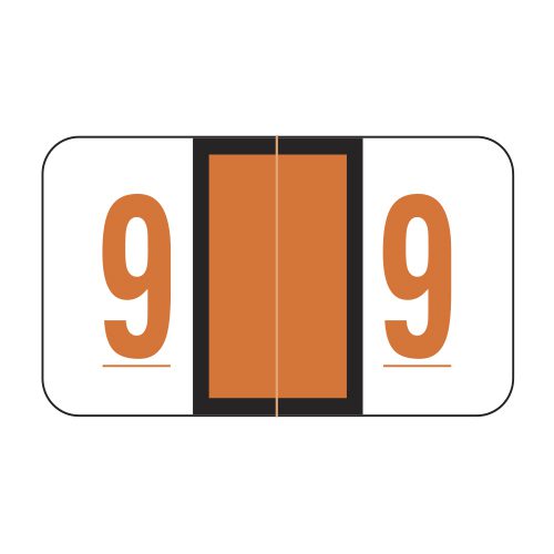 These are POS 3500 compatible number “9” labels. Each label wraps around the end of a file folder to label that folder for numerical filing. They feature a wrap-around solid orange color bar and a matching color number “9” printed on a white background. The number “9” will be visible on each side of the folder when applied. Each label is 1-5/8″ wide and 15/16″ high. Labels are laminated and sold per roll of 500.