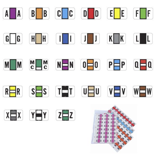 These are POS Compatible Alpha Ringbook Sheets. Each label wraps around the end of a file folder to label that folder for alphabetical filing. These labels are solid color with a double white letter character. The letter will be visible on each side of the the folder when applied. Each label is 1-5/8″ wide and 15/16″ high. Labels are laminated and sold in pack of 3,120 labels.