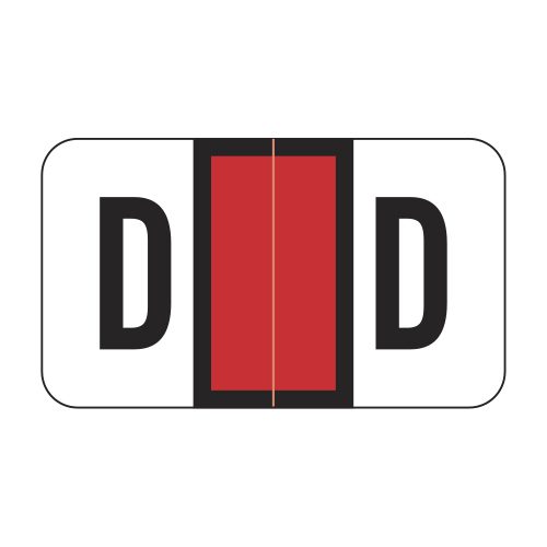 These are POS compatible letter “D” alpha ringbook sheets. Each label wraps around the end of a file folder to label that folder for alphabetical filing. These labels feature a wrap-around solid red bar and a colored letter “D” printed on a white background. The letter “D” will be visible on each side of the folder when applied. Each label is 1-5/8″ wide and 15/16″ high. Labels are laminated and sold in Roll of 240.