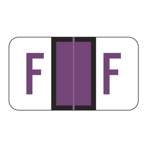 These are POS compatible letter “F” alpha ringbook sheets. Each label wraps around the end of a file folder to label that folder for alphabetical filing. These labels feature a wrap-around solid purple bar and a colored letter “F” printed on a white background. The letter “F” will be visible on each side of the folder when applied. Each label is 1-5/8″ wide and 15/16″ high. Labels are laminated and sold in Roll of 240.