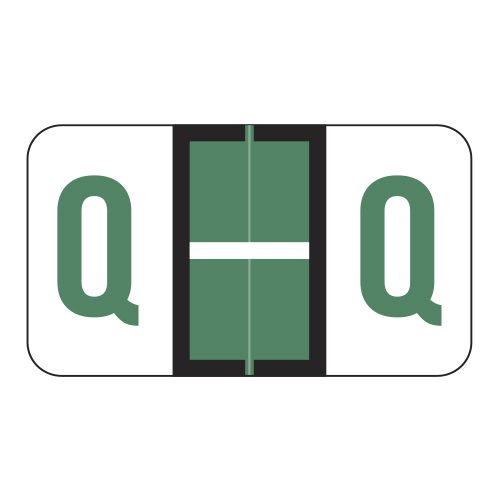 These are POS compatible letter “Q” alpha ringbook sheets. Each label wraps around the end of a file folder to label that folder for alphabetical filing. These labels feature a wrap-around solid dark green bar and a colored letter “Q” printed on a white background. The letter “Q” will be visible on each side of the folder when applied. Each label is 1-5/8″ wide and 15/16″ high. Labels are laminated and sold in Roll of 240.