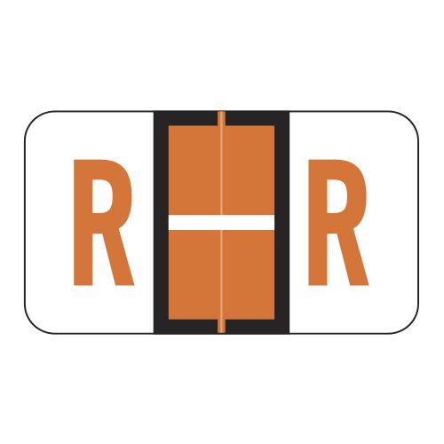 These are POS compatible letter “R” alpha ringbook sheets. Each label wraps around the end of a file folder to label that folder for alphabetical filing. These labels feature a wrap-around solid orange bar and a colored letter “R” printed on a white background. The letter “R” will be visible on each side of the folder when applied. Each label is 1-5/8″ wide and 15/16″ high. Labels are laminated and sold in Roll of 240.