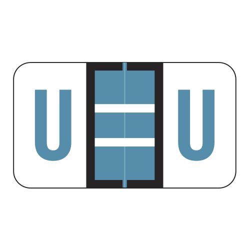 These are POS compatible letter “U” alpha ringbook sheets. Each label wraps around the end of a file folder to label that folder for alphabetical filing. These labels feature a wrap-around solid blue bar and a colored letter “U” printed on a white background. The letter “U” will be visible on each side of the folder when applied. Each label is 1-5/8″ wide and 15/16″ high. Labels are laminated and sold in Roll of 240.