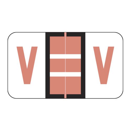 These are POS compatible letter “V” alpha ringbook sheets. Each label wraps around the end of a file folder to label that folder for alphabetical filing. These labels feature a wrap-around solid pink bar and a colored letter “V” printed on a white background. The letter “V” will be visible on each side of the folder when applied. Each label is 1-5/8″ wide and 15/16″ high. Labels are laminated and sold in Roll of 240.
