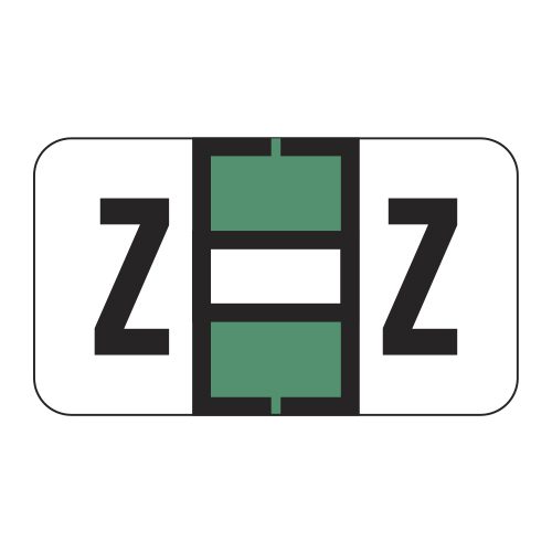 These are POS compatible letter “Z” alpha ringbook sheets. Each label wraps around the end of a file folder to label that folder for alphabetical filing. These labels feature a wrap-around solid dark green bar and a colored letter “Z” printed on a white background. The letter “Z” will be visible on each side of the folder when applied. Each label is 1-5/8″ wide and 15/16″ high. Labels are laminated and sold in Roll of 240.