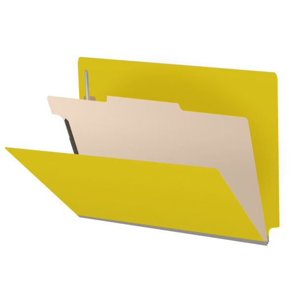 These end tab pressboard classification;folders are designed to allow you to divide your documents into multiple sections. THESE FOLDERS WILL NOT FIT IN FILE DRAWERS. These end tab classification folders are designed for filing on shelves. Whether they are active or inactive records, pressboard folders are designed to stand up and last even in the most demanding environment. All pressboard products feature lemon yellow Tyvek expansions which allow the file to expand as needed. These 25 pt yellow pressboard folders also feature a 18 pt manila divider with two bonded fasteners.